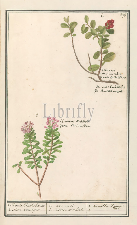 Bearberry, Arctostaphylos uva-ursi, Sharp pepper tree, Daphne cneorum, 1, Roode Kraecke beien 2, Steen rosejen, uva ursi 2, Cneoron Mathioli, aureilles Rouges, 2, title, object, sharp pepper tree, rock rose, Numbered top right, 278, names, different languages, Part, third album, drawings, flowers, plants, Tenth, twelve albums, animals, birds, 1600, commissioned, Emperor Rudolf II, explanations, Dutch, Latin, French, Anselmus Boetius de Boodt, 1596, 1610, paper, watercolor, paint, deck paint, chalk, ink, pen