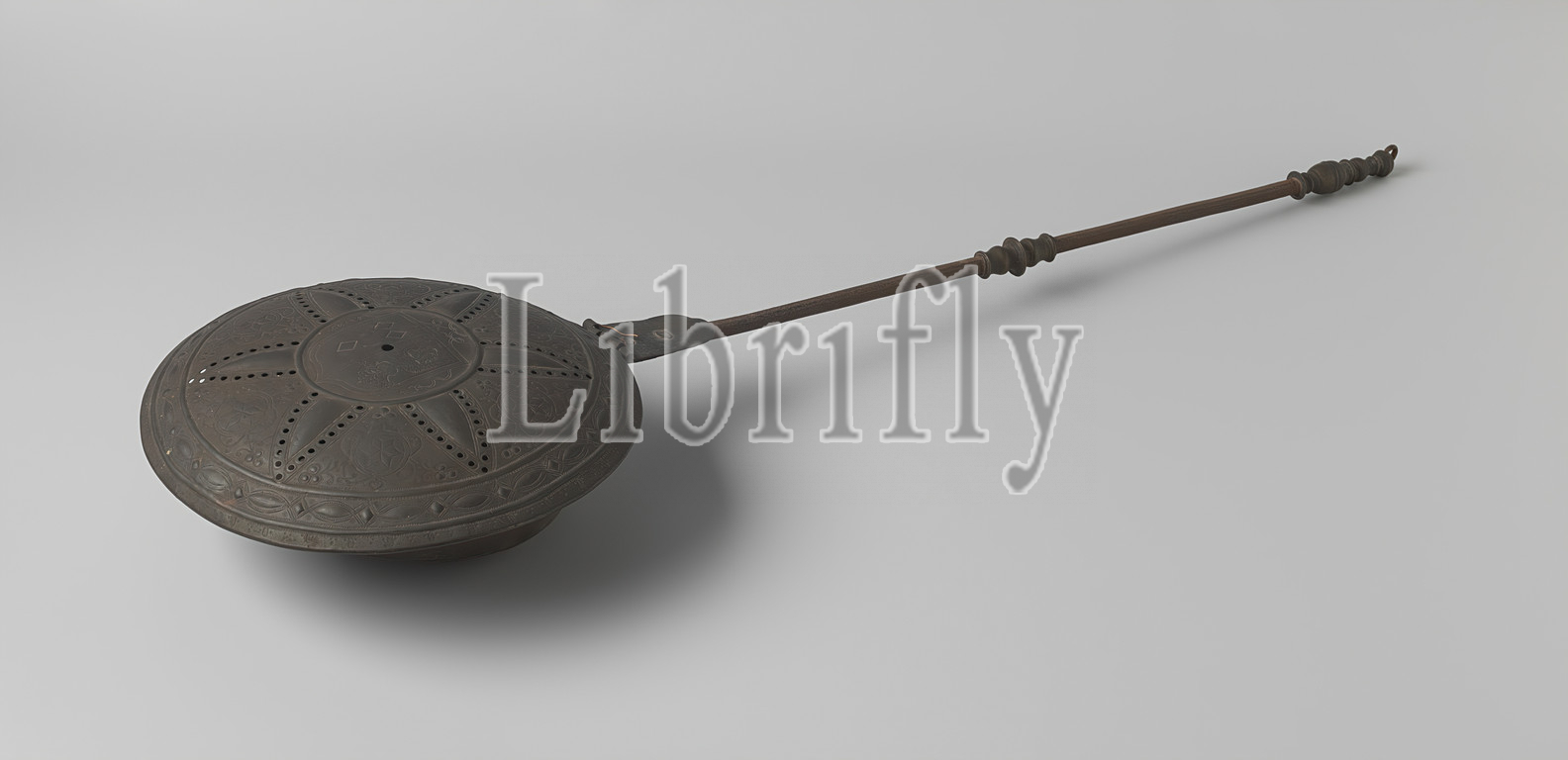 Bedpan with engraved weapon, The object consists of six parts: the iron handle with the ring on which the copper box is riveted, the copper hinge, the copper lid, the two molded decorative elements on the handle. In the convex cover, the center point of which has been enlarged to a hole, decorations are punched and punched with the aid of a stamp shape and holes are provided in a six-pointed star shape. A weapon hung on a cord is engraved in the middle: 1 three diamonds 2/1, 2 an eagle. The fields between the star points have a star in a rosette and other motifs, which are indicated with granulated lines. Around it a correspondingly arranged rim of tapered ovals and diamonds. The edge of the lid is reinforced with iron wire. The profiled decorative element on the stem has a knot in the middle, in the end piece a vase and a baluster can be recognized. The hinge pin and the hanging ring are missing., anonymous, Nederlanden, c. 1600 - c. 1650, brass (alloy), iron (metal), engraving, l 105 cm × d 27 cm × d 33 cm × h 12 cm