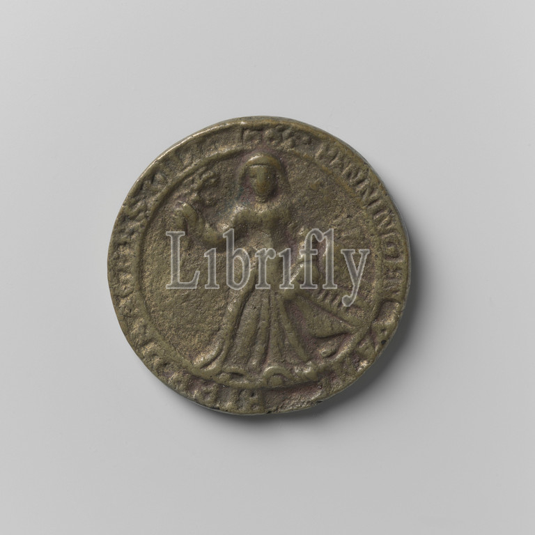 Beer Carrier Guild of Amsterdam, Guild Medal of Joost Rens Huyen, Brass Medal. Obverse: a woman with a branch hoppe in a raised right and shield with a carrying line in left hand within an inscription. Reverse: two men who hold a barrel between them, cut off: inscription, Amsterdam, Joost Rens Huyen, anonymous, 1665, brass (alloy), engraving, d 3.5 cm × w 24.65 gr