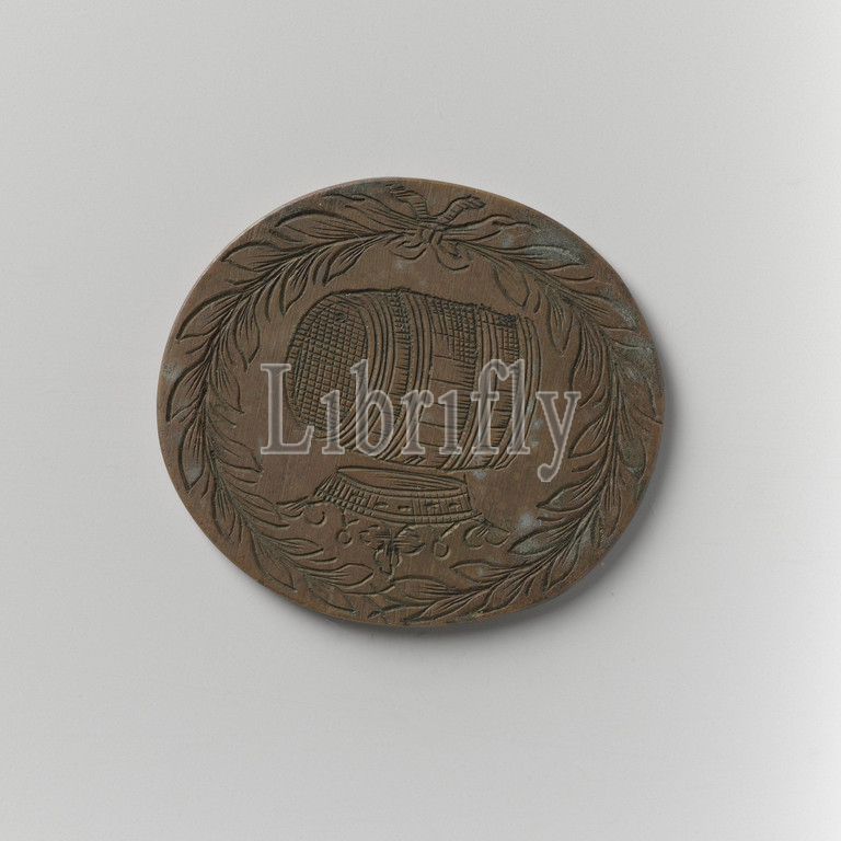 Beer protector guild of Amsterdam, guild token by Jacob Barentsz Zluyter, Brass oval guild token. Front: crowned barrel within a leaf wreath. Reverse: inscription within a wreath, Amsterdam, Jacob Barentsz Zluyter, anonymous, c. 1400 - c. 1885, brass (alloy), engraving, h 3.4 cm × w 3.8 cm × w 15.67 gr