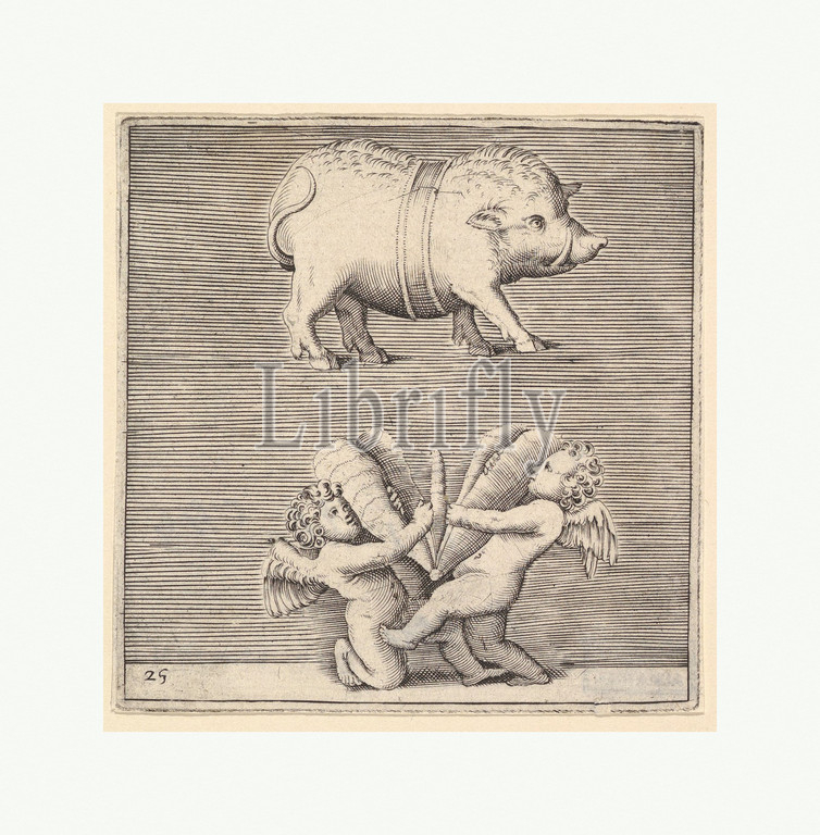 A Belted Pig and Two Cupids (or Geniuses) with a Butterfly (or Moth), published ca. 1599–1622, Engraving. Third state., plate: 3 7/16 x 4 7/8 in. (8.8 x 12.4 cm), Prints, Engraved by Anonymous, Italian, 16th century, After Battista Franco (Italian, Venice ca. 1510–1561 Venice)