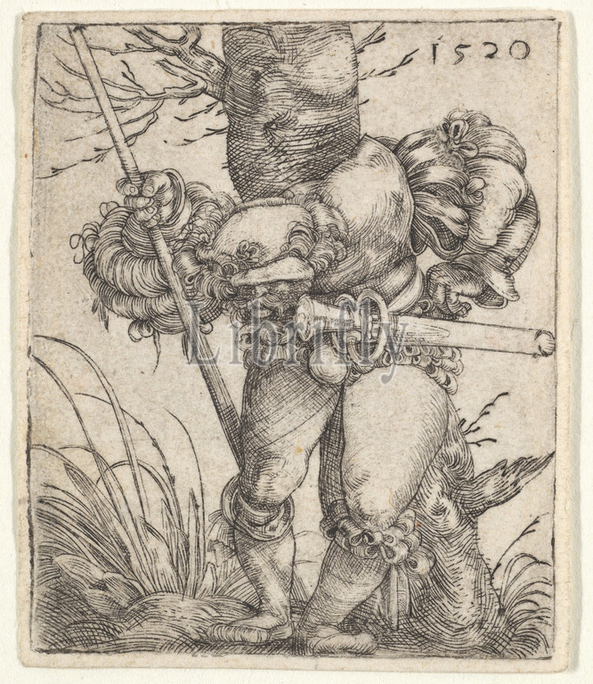 Bending Soldier Leaning, Tree, 1520, Engraving, Sheet, 1 15/16, 5/8, 5, 4.2 cm, Prints, Barthel Beham, German, Nuremberg ca., 1502–1540, Italy