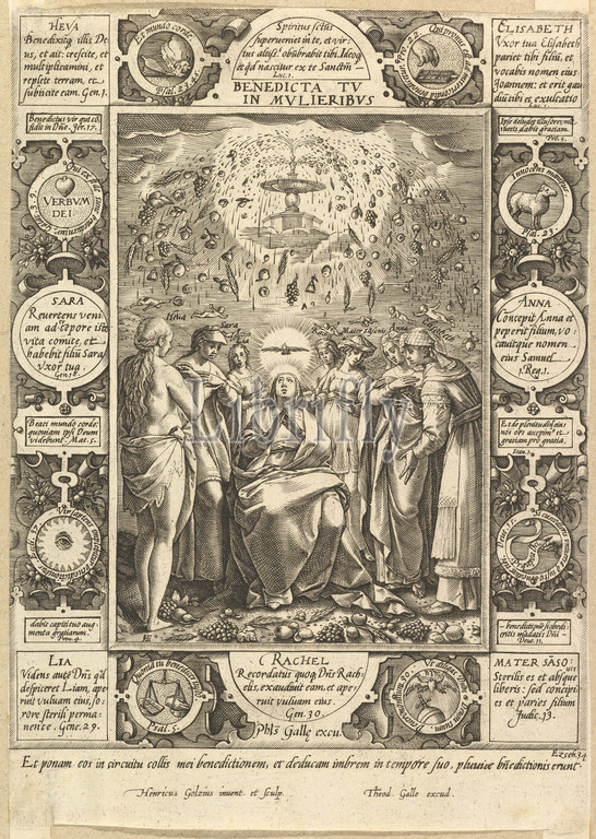 Benedicta tu, Mulieribus, Christian, Profane Allegories, Engraving, sheet, 10 5/16 x 7 5/16, 26.2 18.5 cm, Prints, Hendrick Goltzius, Netherlandish, Mühlbracht, 1558–1617, Haarlem
