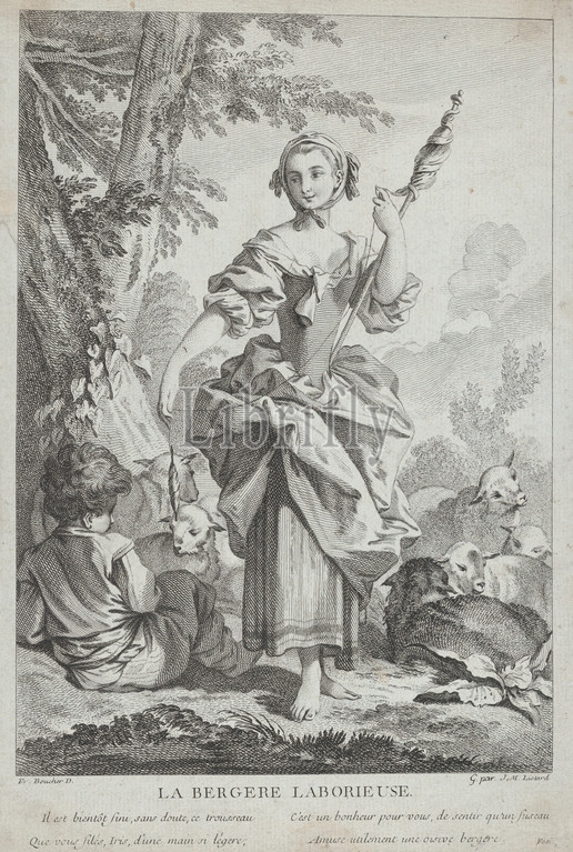 La Bergère Laborieuse, 18th century, Etching and engraving, sheet: 11 5/16 x 7 11/16 in. (28.8 x 19.5 cm), Prints, After François Boucher (French, Paris 1703–1770 Paris), Jean Michel Liotard (Swiss, Geneva 1702–1796 Geneva)