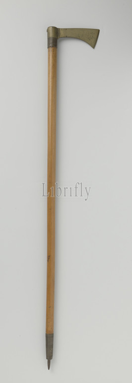 Bergwerkers' stick, Bamboo stick with a copper ax with inscription at the end, enclosed in a wide iron fitting at the other end and with a pin on the other side. Inscription: IHS. Dated: 1754., Europe, 1754, bamboo, copper (metal), iron (metal), engraving, l 97.5 cm × l 14.8 cm w 5.6 cm d 3 cm
