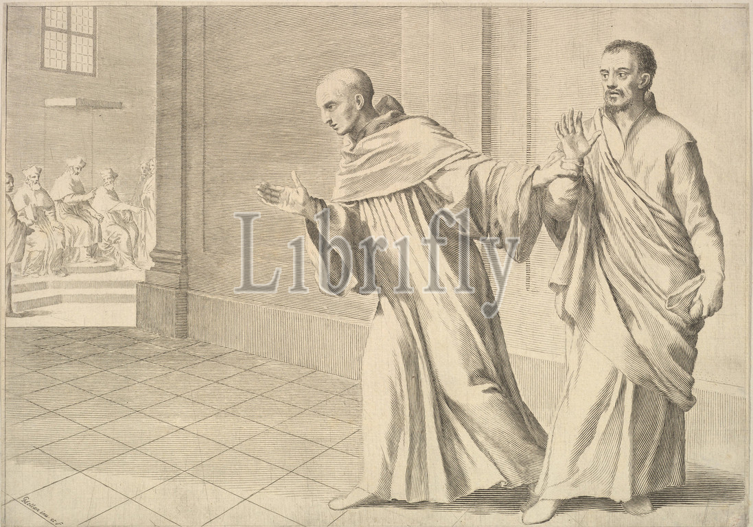 St. Bernard Taking a Brother to an Assembly, Engraving, sheet: 9 1/4 x 13 1/8 in. (23.5 x 33.3 cm), Prints, Claude Mellan (French, Abbeville 1598–1688 Paris)