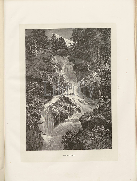 Berninafall, Illustration of the 19th century Berninafall, wood engraving, bound to page 414, Woldemar Kaden: Das Schweizerland: eine Sommerfahrt durch Gebirg und Thal. Stuttgart: Engelhorn, 1875
