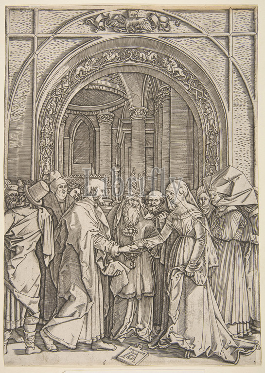 Betrothal, Virgin, Life, copy, early 16th century, Engraving, Sheet, 11 7/16, 8 1/8, 29, 20.6 cm, Prints, After Albrecht Dürer, German, Nuremberg, 1471–1528, Marcantonio Raimondi, Italian, Argini, ca., 1480–before, 1534, Bologna