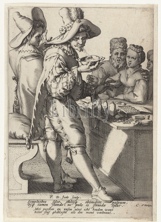 Better blown, mouth burned, Two charlatans, table, bottles, jars, coins, blows, bowl, hot liquid, margin, caption, two lines, Latin, Dutch, showing, charlatan, careful, prevent misery, Proverbs, sayings, etc, BETTER SAVE THAN SORRY, clothes, costume, men's clothes, head-gear, hat, Pieter de Jode, I, mentioned, object, Netherlands, 1590, 1632, paper, engraving