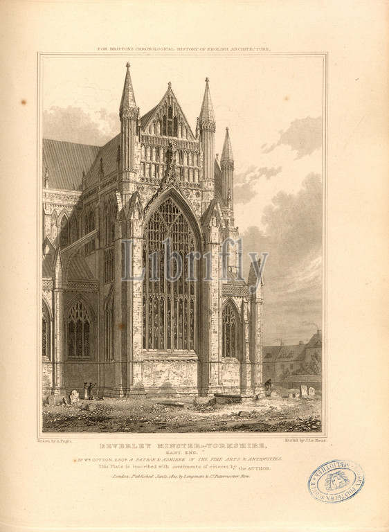 Beverley Minster, Yorkshire, east end, Beverley Minster at Beverley, East Riding of Yorkshire, signed: Drawn by A. Pugin; Etch'd by I. Le Keux; Published by Longman & Co, Fig. 45, p. 260, Pugin, Augustus Charles (drawing); Keux, John Le (etching); Longman & Co. (published), 1821, John Britton: The architectural antiquities of Great Britain: represented and illustrated in a series of views, elevations, plans, sections and details of various ancient English edifices: with historical and descriptive accounts of each. Bd. 5. London: J. Taylor, 1807-1826