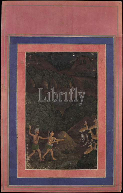 Bhil Couple Hunting Deer, Night, Folio, Davis Album, 18th century, Attributed, India, Ink, opaque watercolor, gold, paper, Page, H, 13 1/8, 33.3 cm, Codices