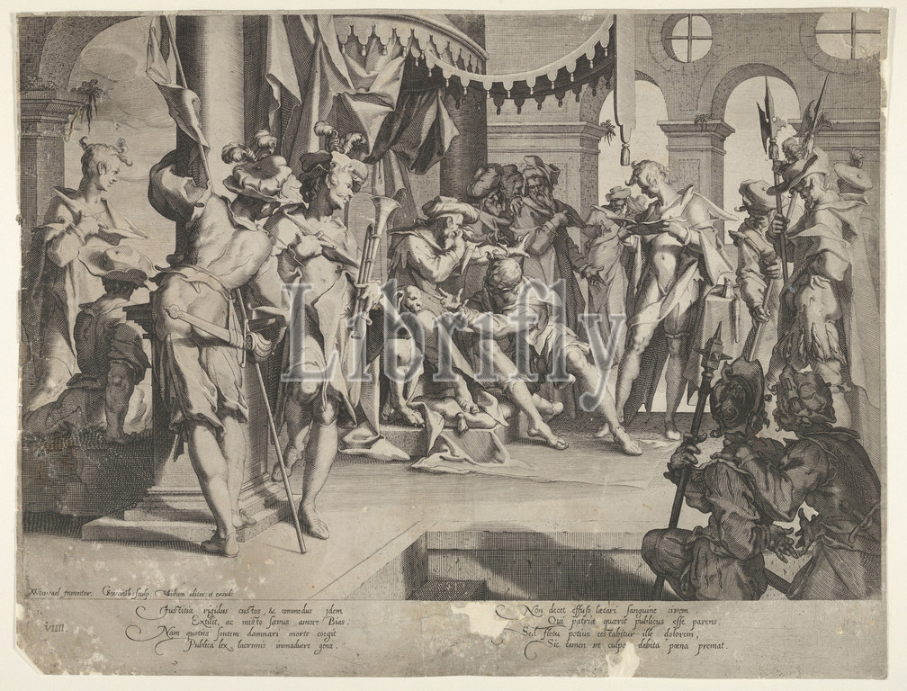 Bias weeps and condemns, plate IX from Thronus Justitiæ, 1605, Engraving, sheet: 11 3/4 x 15 3/8 in. (29.9 x 39 cm), Prints, Joachim Wtewael (Netherlandish, Utrecht 1566–1638 Utrecht), Willem van Swanenburg (Netherlandish, ca. 1581/82–1612)