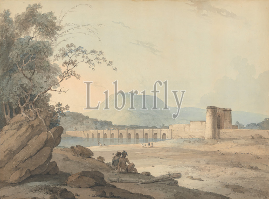 Bidzee Ghur, Village Mow Mhow, Samuel Davis, 1757–1819, British, Watercolor, pen, gray ink, graphite, moderately thick, moderately textured, cream, laid paper, mounted, moderately thick, moderately textured, cream, wove paper, Sheet, Image, architectural subject, figures, landscape, water