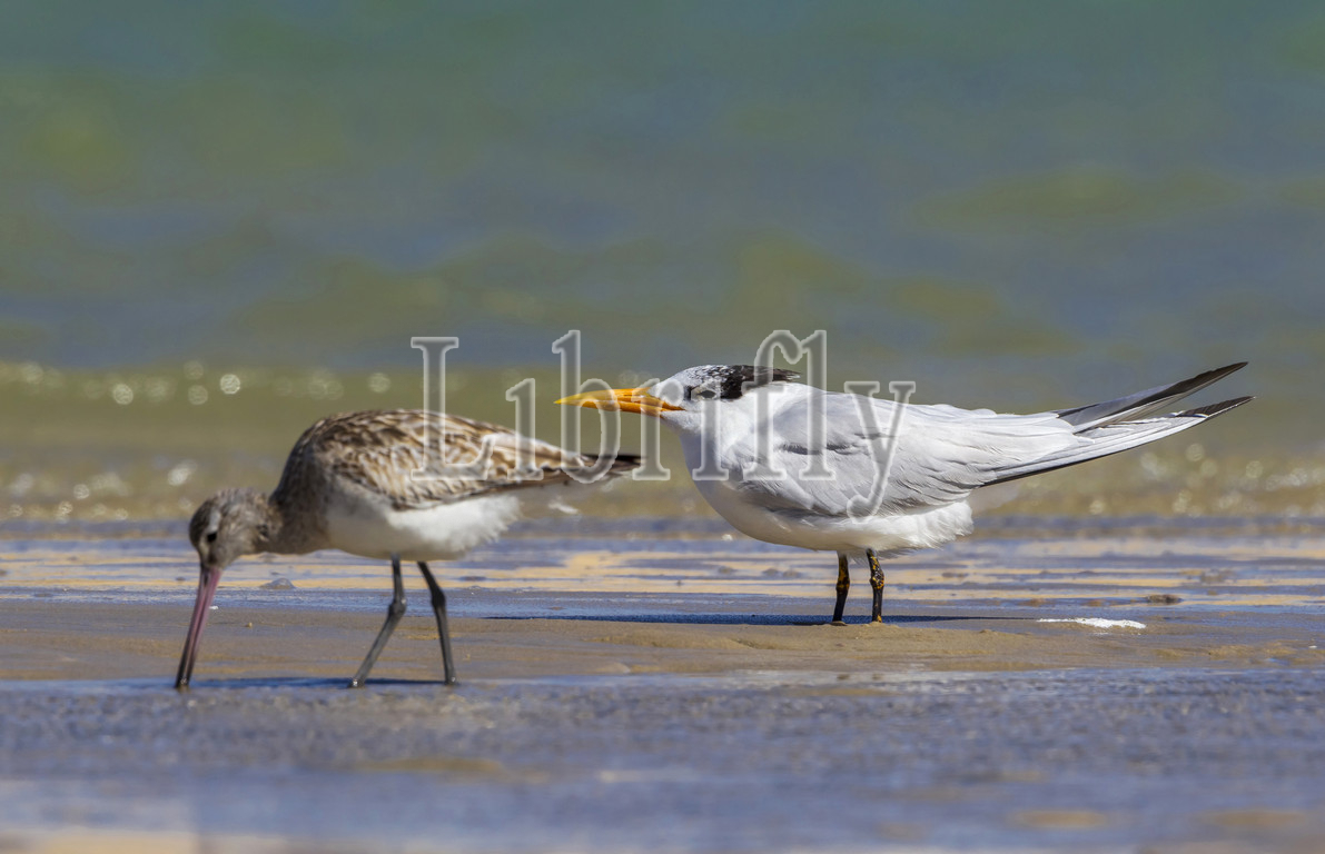 This bird was found in Dakhla bay on the beach Bar-tailed Godwit just past in front of the Royal Tern, Limosa lapponica, Thalasseus maximus