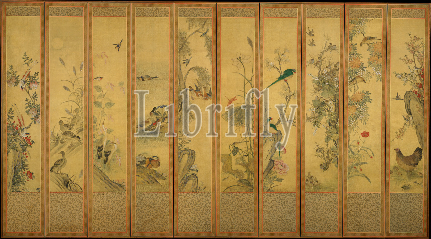 Birds and Flowers, Joseon dynasty (1392–1910), late 19th–early 20th century, Korea, Ten-panel folding screen; ink and color on silk, Image (each panel): 54 3/8 x 10 3/8 in. (138.1 x 26.4 cm), Screens, Unidentified Artist Korean, Paintings of birds and flowers have a long tradition in East Asian art. In Korea folding screens depicting combinations of birds and flowers became prevalent in the late Joseon period and continued to be popular in the twentieth century
