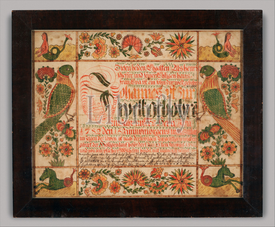 Birth, Baptismal Certificate, 1782, Lancaster County, Pennsylvania, United States, American, Ink, watercolor, paper, 12 5/8 x 15 3/4, 32.1 40 cm, Drawings, Johann Heinrich Otto, ca., 1733–ca., 1800