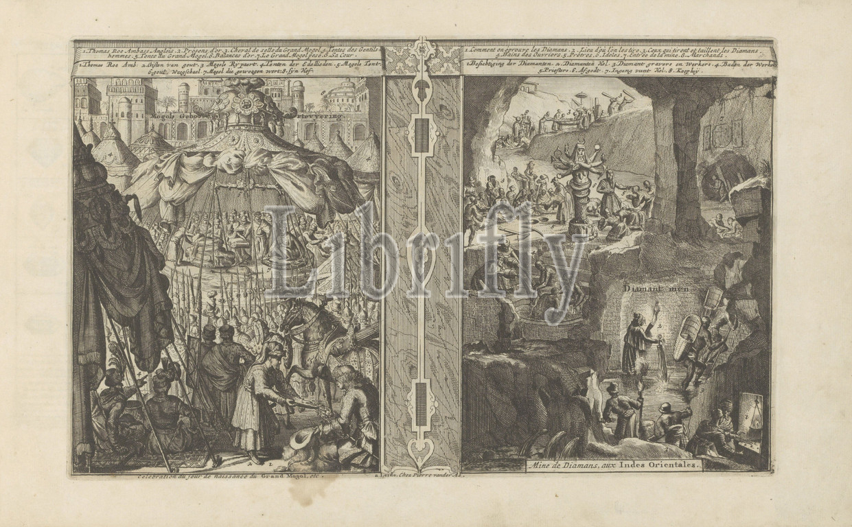 Birth celebration, Mongolia, Diamond mine Mogols Birth celebration, Celebration au jour de naissance du Grand Mogol, etc, Diamond mine, Mine de Diamans, aux Indes Orientales, title, object, Indes Orientales, Occidentales, autres lieux, series title, Presentation, two parts, left, birth celebration, prince, weighed, tent, Bags, money, placed, counterweight, Noblemen watch, foreground, English ambassador Thomas Roe gets, dish, gold, image, right, diamond mine, Priests kneel, statue, legend, French, Dutch, print, part, album, mine, precious, semi-precise stones, diamonds, festivities, Mongolians, Asian races, peoples, East India, Thomas Roe, Romeyn de Hooghe, Leiden, 1682, 1733, paper, etching
