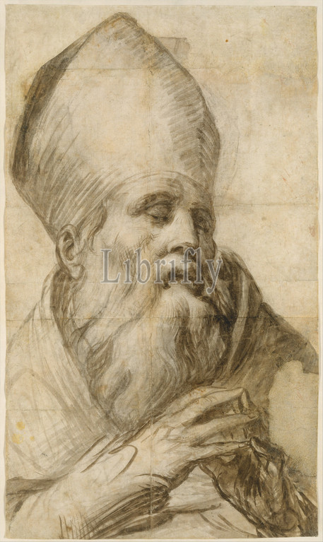 Bishop Saint, Bust-Length, Cartoon, Altarpiece, 1503–40, Brush, brown wash, black chalk, 28-1/4 x 16-1/16, 71.8 40.8 cm, Drawings, Parmigianino, Girolamo Francesco Maria Mazzola, Italian, Parma, 1503–1540, Casalmaggiore, boldly, executed, drawing, extant cartoon, full-scale drawing, monumental scale, definitively assigned, great masters, Italian Mannerism, born, trained, worked, Rome, Bologna, 1520s, returning, native city