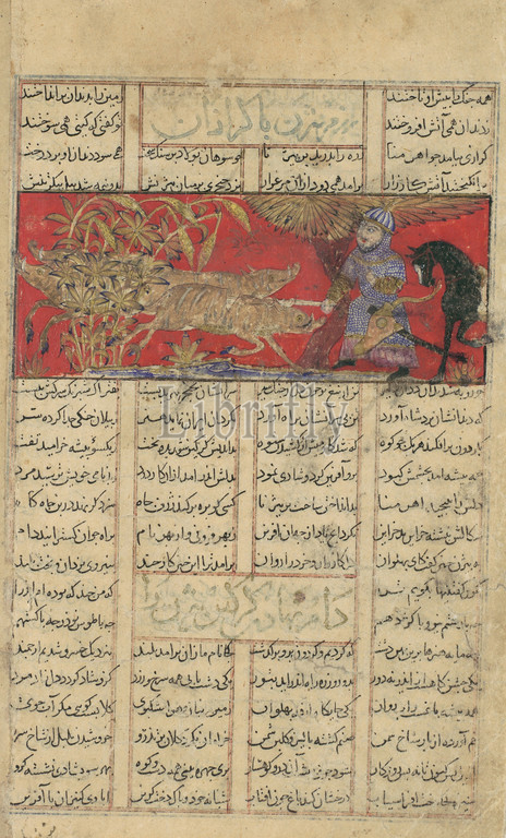Bizhan Slaughters, Wild Boars, Irman, Folio, Shahnama, Book, Kings, Firdausi, ca, 1330–40, Attributed, Iran, Isfahan, Ink, opaque watercolor, gold, silver, paper, Painting, H, 1 5/8, 4.2 cm, Codices, people, Armenia, complained, shah, plague, ferocious, destructive wild, boars, Bizhan, impetuous young, hero, volunteered, rid, forest, artist, departed, text, poem, showing Bizhan, foot, forgetting, young man, should, facial hair, result, enhancing, danger, drama, encounter
