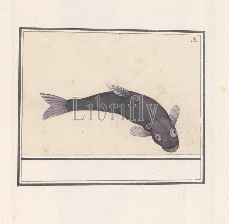 Black carp, Cyprinus carpio carpio, unidentified fish, black koi carp, Hajiro koi, Numbered top right, 3, Part, sixth album, drawings, fish, shells, insects, Sixth, twelve albums, animals, birds, plants, 1600, commissioned, Emperor Rudolf II, explanations, Dutch, Latin, French, bony fishes, carp, Anselmus Boetius de Boodt, 1596, 1610, paper, pencil, chalk, watercolor, paint, deck paint, lacquer, coating, brush