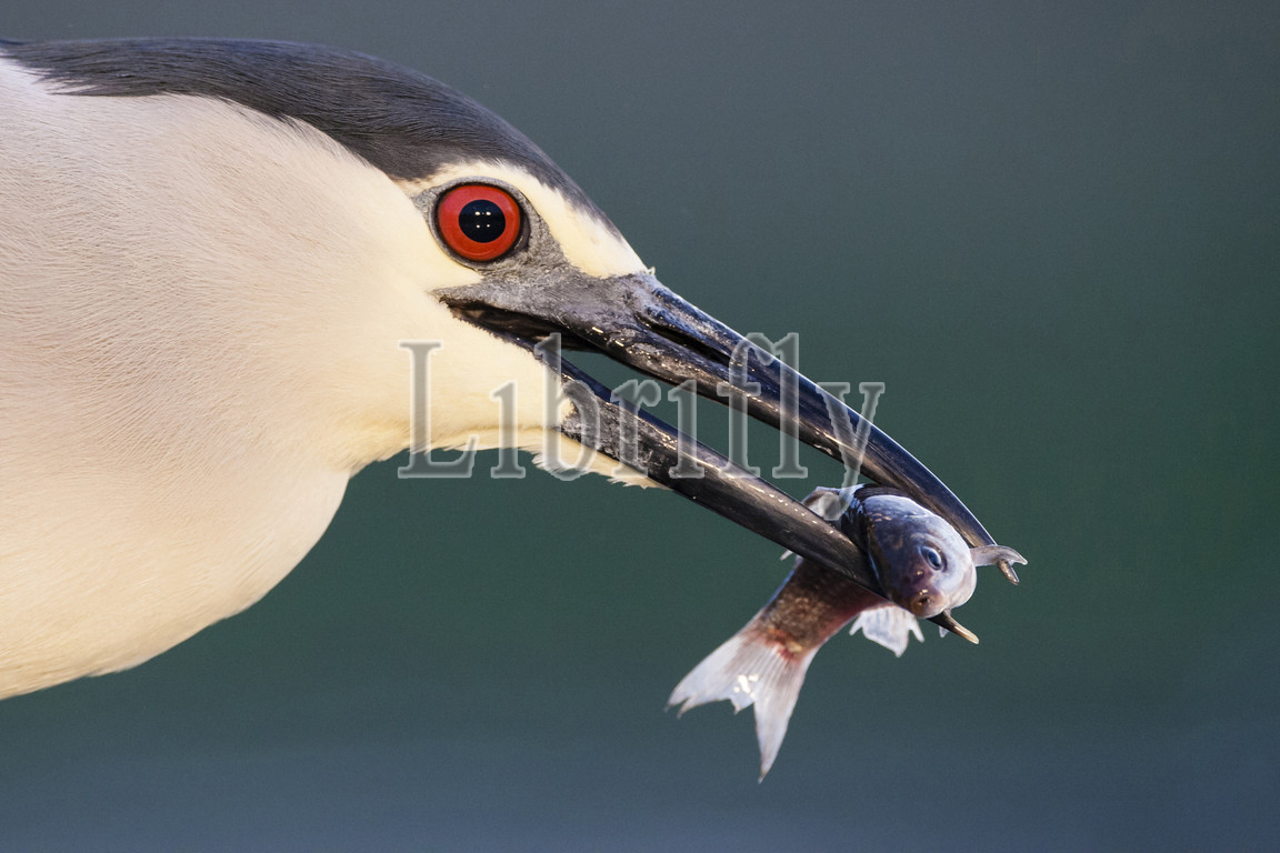 Black-crowned Night Heron with caught fish in beak, Nycticorax nycticorax, Hungary