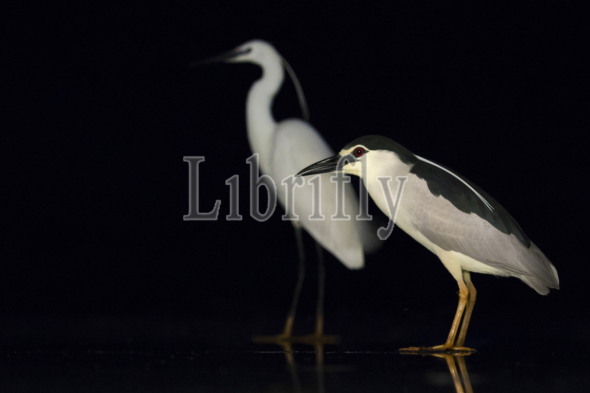 Black-crowned Night Heron standing on ice with Little Egret in background, Nycticorax nycticorax, Egretta garzetta, Hungary