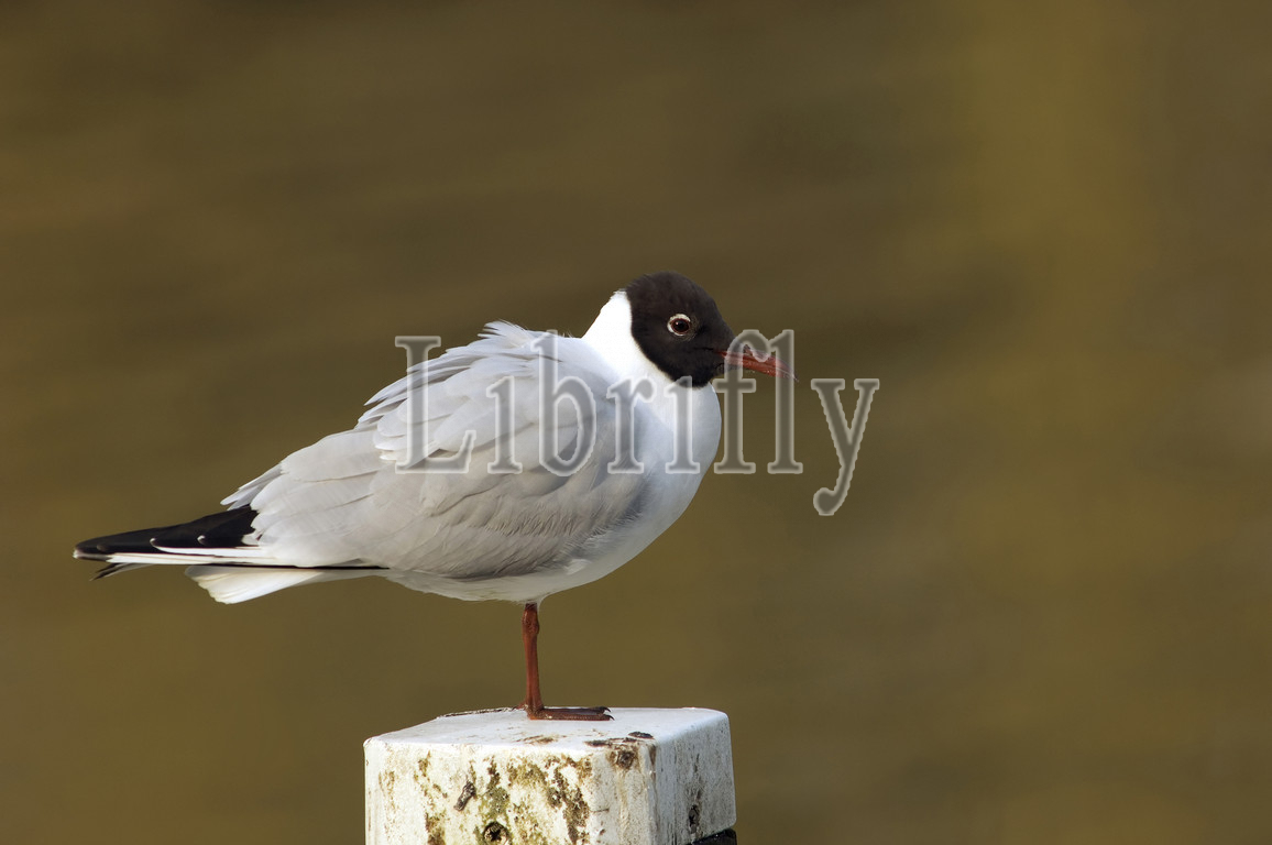Black-headed Gull standing on mooring post Netherlands, Chroicocephalus ridibundus