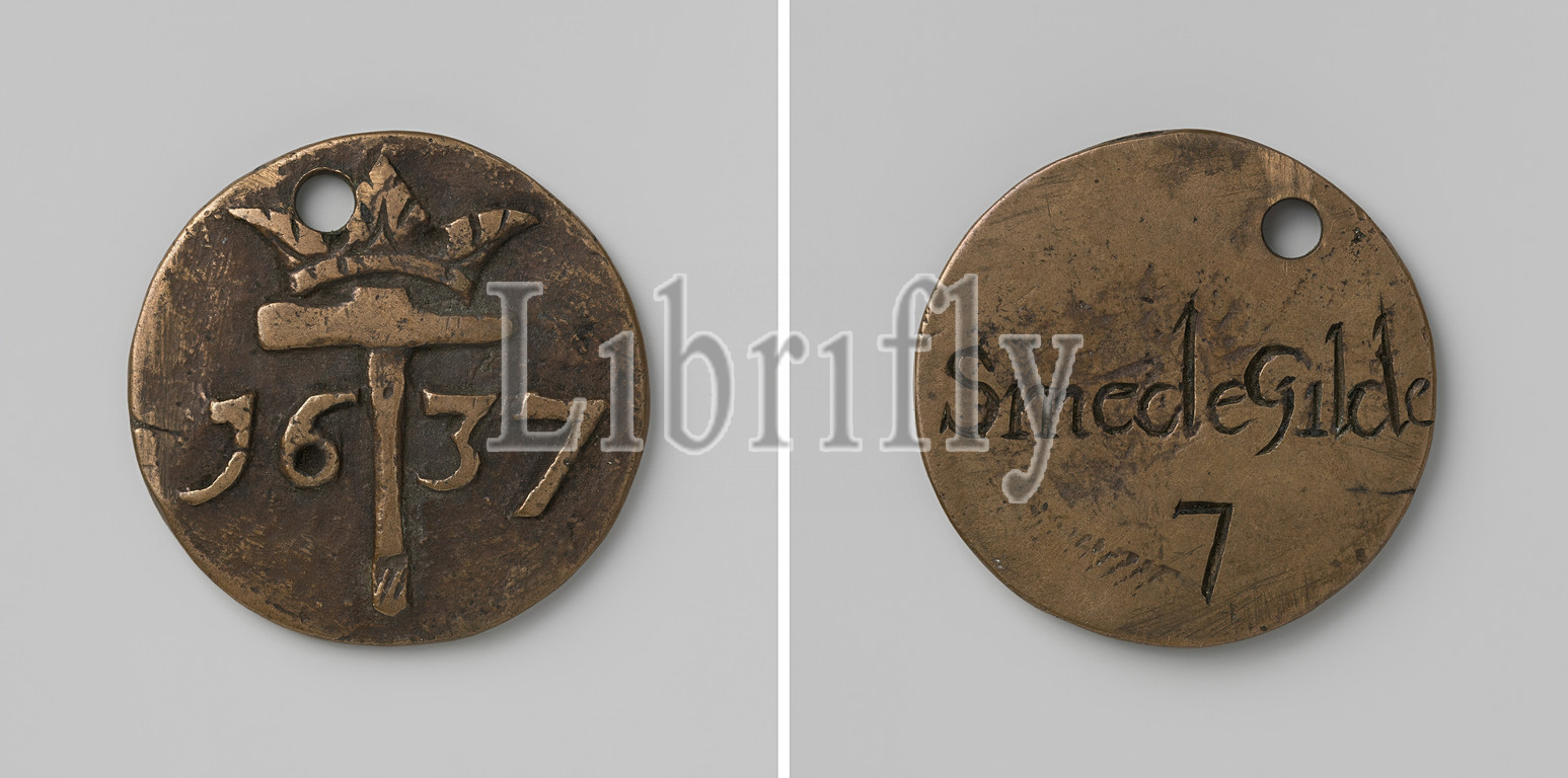Blacksmith guild of Goes, guild token with no. 7, Brass medal with hole in it. Front: crowned front hammer between years. Reverse: inscription above number 7, Goes, anonymous, 1637, brass (alloy), engraving, d 3.6 cm × w 21.29 gr