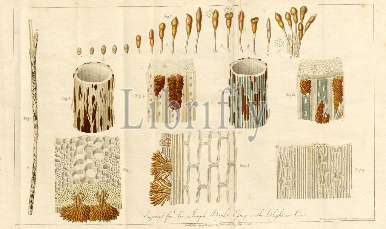 The Blight in Corn, Mildew at the grain, signed: Drawn by Francis Bauer; Engraved by F. Sansom; Pub, by H.D. Symonds, Plate 7, p. 14, Bauer, Francis (drawing); Sansom, F. (engraving); Symonds, H. D. (publ.), William Curtis: Practical observations of the British grasses, especially such as are best adapted to the laying down or improving of meadows and pastures: likewise, an enumeration of the British grasses. London: printed for H. D. Symonds, 1805