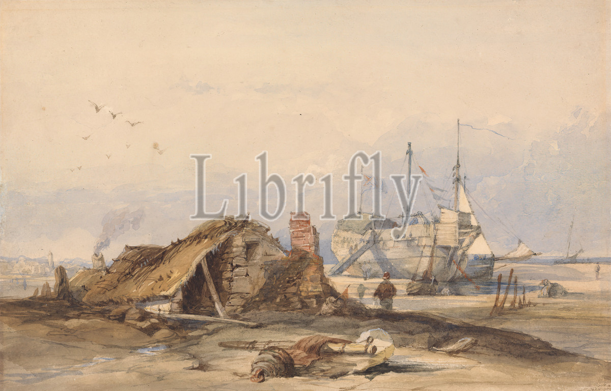 Blockade Station, Rye, Clarkson Stanfield, 1793–1867, British, Watercolor, graphite, medium, slightly textured, cream wove paper, Sheet, beach, birds, boats, flags, genre subject, hulk, utility, service vessel, marine art, shack, ship, smoke, England, Rye, Sussex, East, United Kingdom