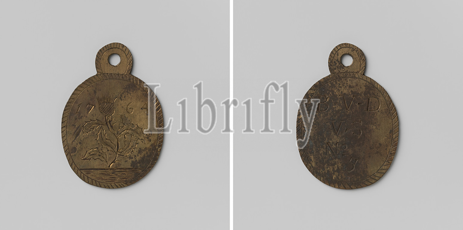 Blok Vughterstraat, s-Hertogenbosch, medal, no, 5, Brass oval medal, eye, Front, thistle, year within shaded edge, Reverse, inscription inside shaded edge, Vughterstraat, s Hertogenbosch, 1764, brass, alloy, engraving