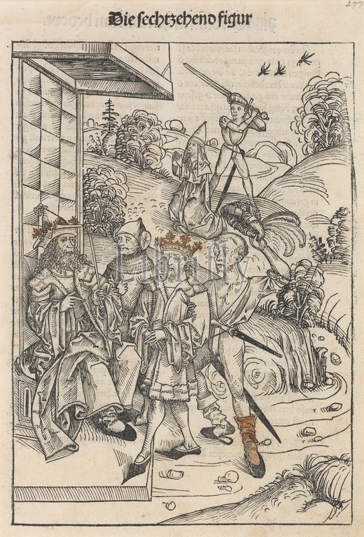 Bloodthirsty King, Michael Wohlgemuth, German, 1434-1519, 1491, woodblock print, touches, watercolor, off-white laid paper, 11-1/2 x 8-1/4, sheet, series, Schatzbehalter