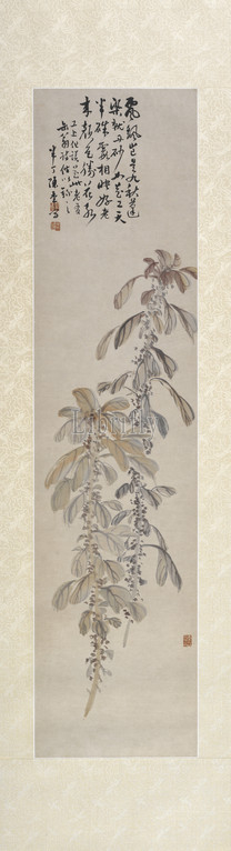 Blossoms, Chen Banding, Chinese, 1877-1970, Modern {Chinese period}, 1936, ink, color, paper, 51-1/4 x 12-1/2, image, 66-5/16 x 18-3/16, overall, Signed, Banding Chen Nian sketched Seals, three, Asian Art