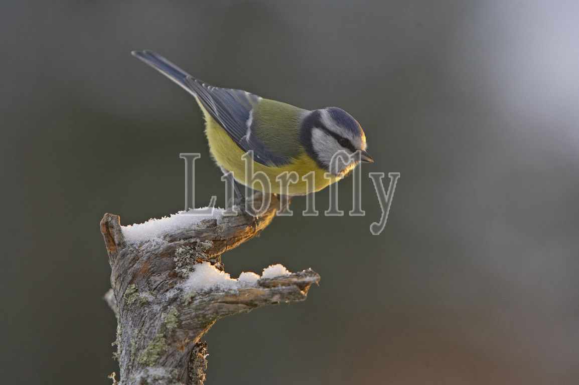 Blue Tit sitting on stick with snow on top