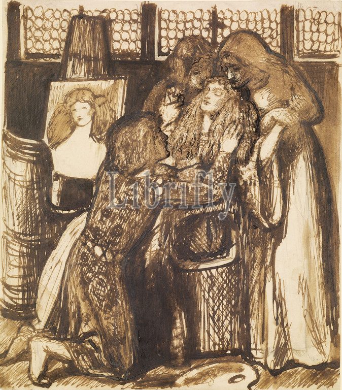 Bonifazio, Mistress, Compositional Study, 1856 Dante Gabriel Rossetti, Illustration, episode, story, St Agnes, Intercession, Rossetti, published, Pre-Raphaelite magazine, Germ, Drawing, Ink, Sketch, Pre-Raphaelite, Illustration, Painting, Easel