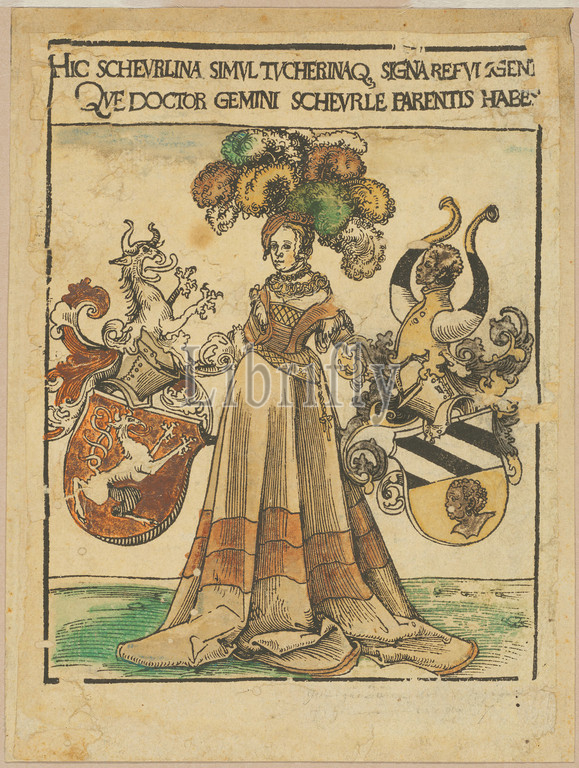 Book-Plate, Scheurl, Tucher, c. 1510, Lucas Cranach, Elder, German, 1472-1553, Germany, Woodcut, black hand colored, brush, watercolor, cream laid paper, laid down, tan laid paper, 165