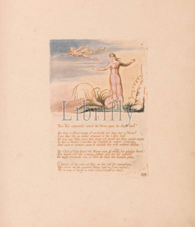 Book, Thel, Plate 6, III, Then Thel astonish'd, Print, William Blake, 1757–1827, British, 1789, Relief etching printed, brown, pen, ink, watercolor, moderately thick, slightly textured, cream wove paper, Sheet, Plate, Spine, 11 1, 2 inches, 29.2 cm, baby, children, infant, leaf, literary theme, men, nudes, plant, religious, mythological subject, sash, text, trees, vines, women