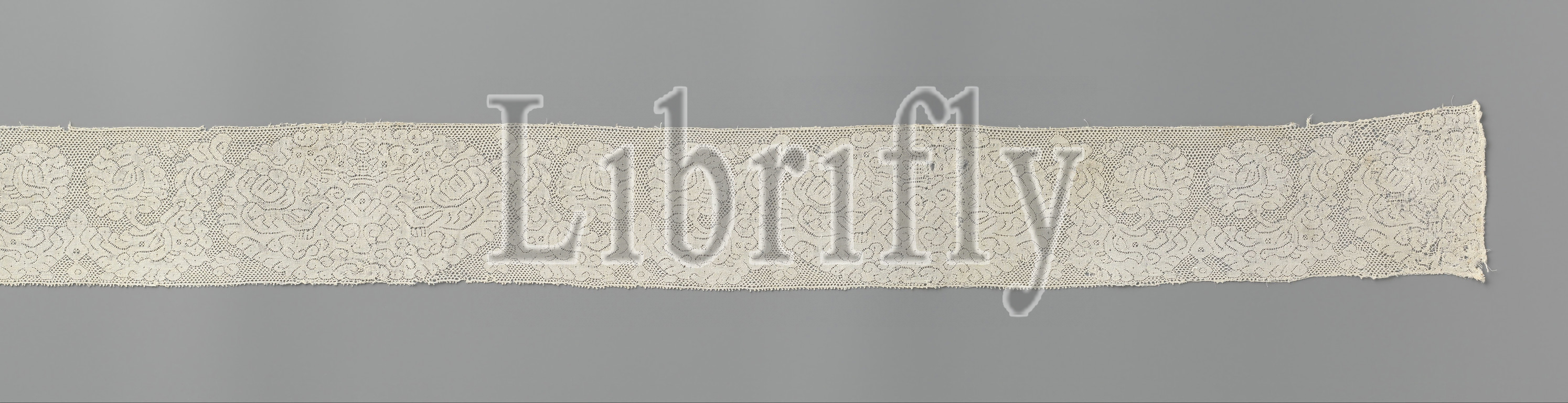 Border, Cloud, Peony Motifs Strip bobbin lace, oval cartouche, tree flanked, little angels, birds, Strip natural Dutch bobbin lace, pattern consists, symmetrical composition, two peonies, cartouche, symmetrical drawing, tree, flanked, side, flying angel, bird, angels, holding, crown together, You, see, peonies, leaves hanging, motifs, linen, connected, round grid, trees, crown, symbol, sovereignty, Southern Netherlands, c, 1650, 1660, material, bobbin lace, l 92