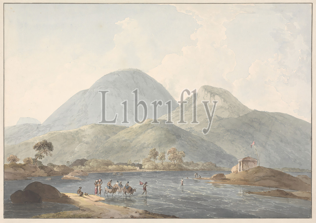 Boree Timranze Durgum Taken from the Pehher River Near Cavenpatan-Barramah'l (South India), Samuel Davis, 1757–1819, British, undated, Watercolor, with pen, in brown ink, and graphite on medium, moderately textured, cream laid paper, Mount: 18 7/16 × 24 1/2 inches (46.8 × 62.2 cm) and Sheet: 14 15/16 × 21 7/16 inches (37.9 × 54.5 cm)