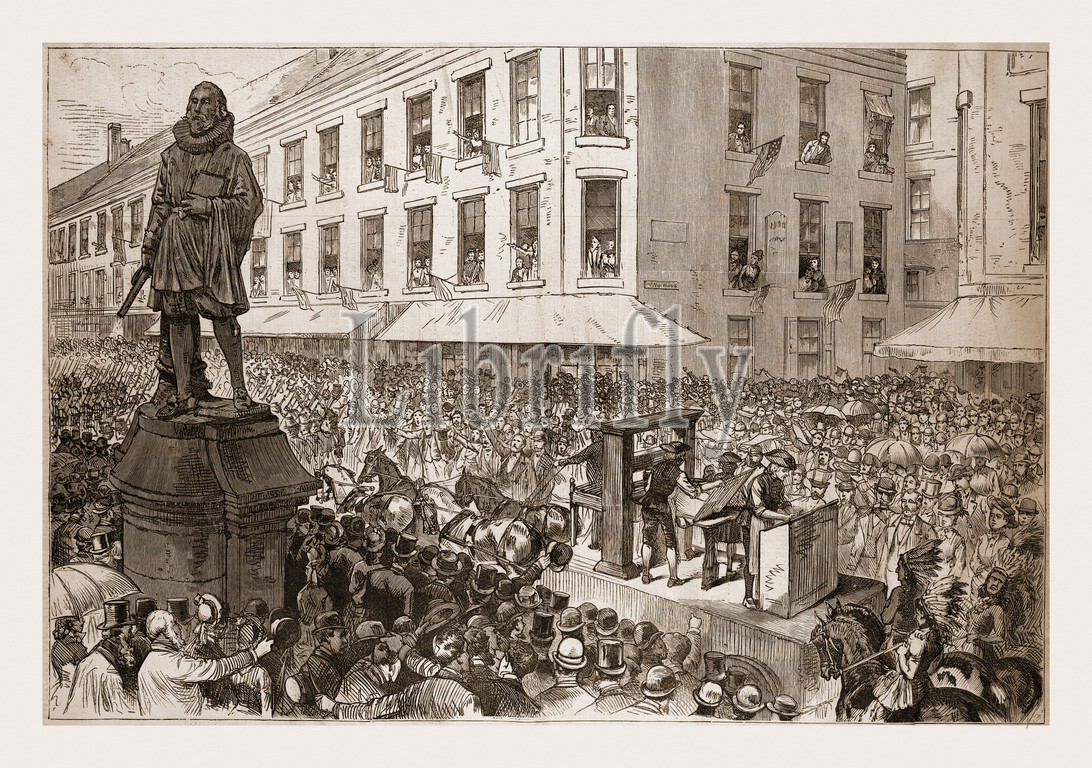 BOSTON CELEBRATION, PROCESSION, PASSING, WINTHROP STATUE, DRAWN, C. GRAHAM, 1880, 19th century engraving, USA, America
