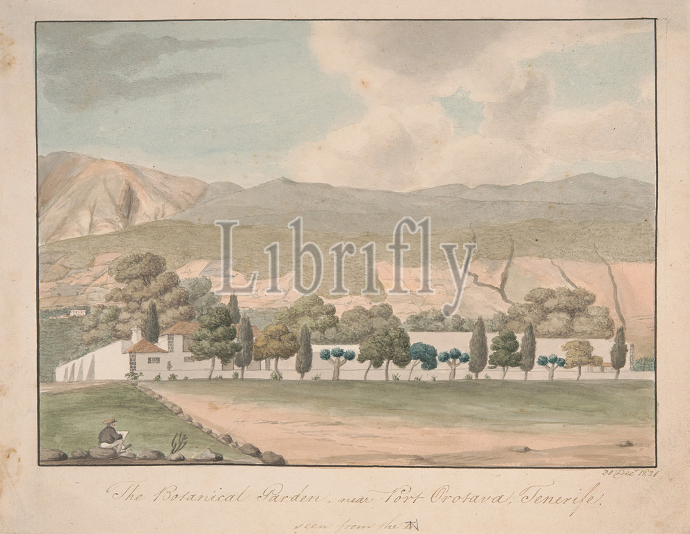 Botanical Garden, Port Orotava, Tenerife, Alfred Diston, active 1818–1829, 1821, Watercolor, pen, brown ink, graphite, medium, slightly textured, cream wove paper, Sheet, architectural subject, botanical garden, figure, mountains, path, trees, Europe, Spain, Tenerife