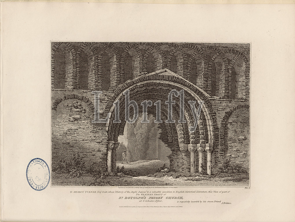 St. Botolph's Priory Church, Portal, St. Botolph's Priory Church, Colchester, Essex, Convention, signed, Engraved, John Roffe, Drawing, S. Prout, Fig. 3, Pl. I., Prout, S., Roffe, John, Engraving, 1805, John Britton, architectural antiquities, Great Britain, represented, illustrated, series, views, elevations, plans, sections, details, various ancient English edifices, historical, descriptive accounts, Bd, 1, London, J, Taylor, 1807-1826