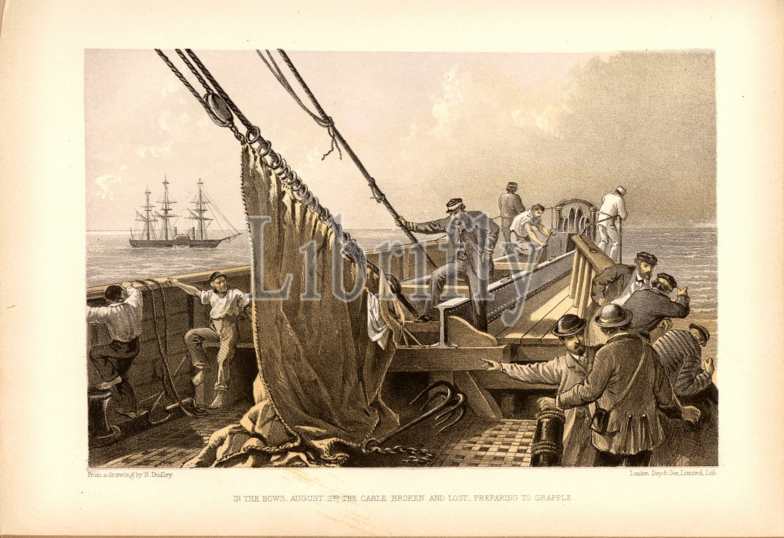 bows, August 2nd, cable broken, lost preparing, grapple, Sailboat Great Eastern, 2 August 1865, rift, transatlantic cable, Signed, drawing, R. Dudley, Day &, Son, Limited, Lith, Fig. 19, p. 76, Dudley, Robert, ill., Day & Co, lith., 1866, William Howard Russell, Robert Dudley, atlantic telegraph, Dedicated, special permission, Royal Highness Albert Edward Prince, Wales, London, Day, son Limited, 1866