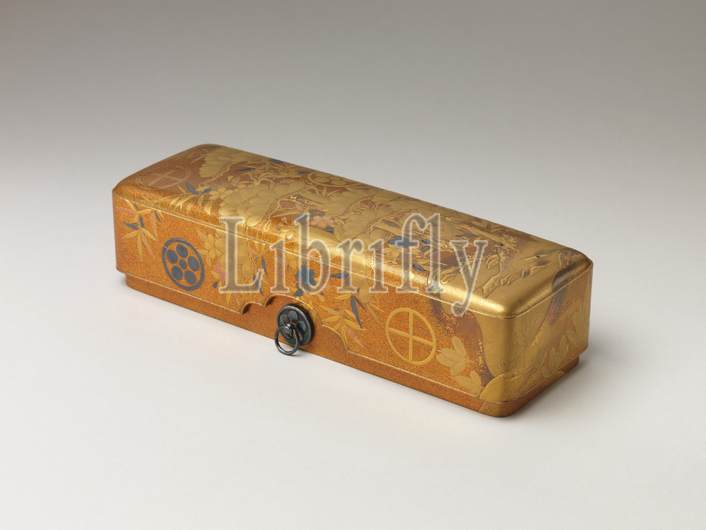 Box, Design, Pine, Bamboo, Cherry Blossom, Edo period, 1615–1868, 19th century, Japan, Sprinkled gold, lacquer, maki-e, W, 12 1/8, 30.8 cm, Lacquer, covered, box, part, wedding trousseau, comprised, thirty, pieces, represents late, Edo-period, decoration, gold, silver, sprinkled, powder, art, finest, Shimazu family, lords, Satsuma, Kyushu, ordered, traditional Taka-hime, married, Matsudaira Sadakazu, lord, Kuwana, Ise Province, 1830