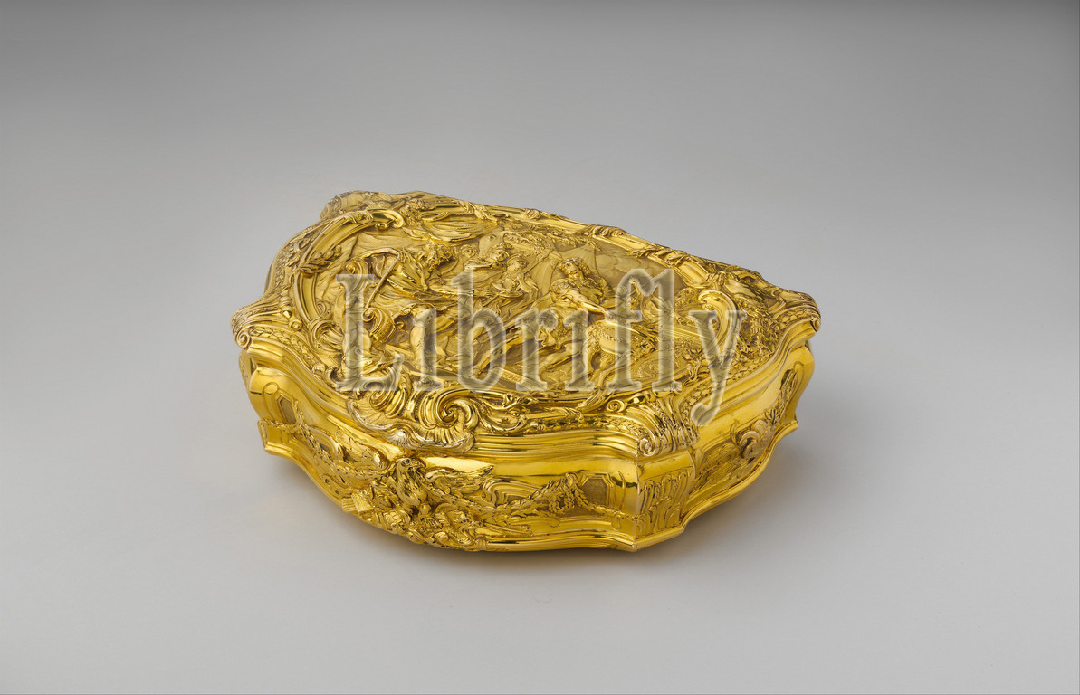 Box, scene depicting Roman hero Gaius Mucius Scaevola, Etruscan king Lars Porsena, Chased, George Michael Moser, 1706–1783, 1741, British, London, Gold, Overall, confirmed, 1 3/4, 4 9/16, 3 5/8, 4.4, 11.6, 9.2 cm, Metalwork-Gold, Platinum, Chased by George, box, finest surviving examples, eighteenth-century English, goldsmiths, work, little, manufacture, history, even, intended function, comparatively large, size, meant, contain snuff, served, presentation box, intended, reward, specific feat, service