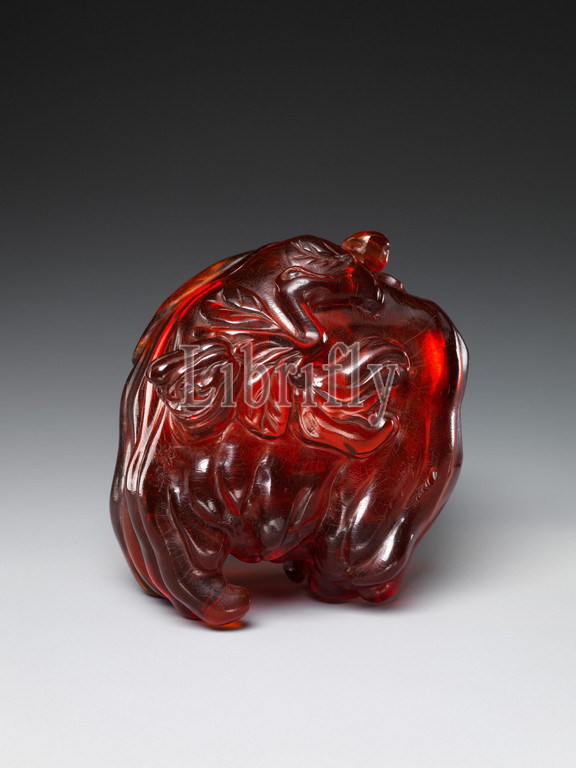 清 琥珀佛手形盒, Box in the shape of Buddha’s hand, Qing dynasty (1644–1911), 19th century, China, Amber, H. 3 in. (7.6 cm); W. 2 1/2 in. (6.4 cm), Amber, The citron-shape of this box has been nicknamed Buddha’s hand (foshou) because the fingerlike segments that grow from the stem of a bright yellow citrus fruit are thought to resemble one of the ritual gestures (mudras) found in Buddhist art