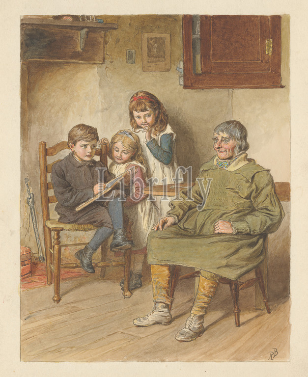 Boy Sketching, Man, Two Girls Watching, Print, Robert Barnes, 1840–1895, British, Robert Barnes, 1840–1895, British, Wood-engraving, watercolor, moderately thick, slightly textured, beige wove paper, Sheet, Image, boots, boy, breeches, chairs, children, coat, cravat, cupboard, dresses, family, genre subject, girls, man, painting, visual work, posing, ribbons, shelf, siblings, sketching, smiling, smocks, socks, stockings, table