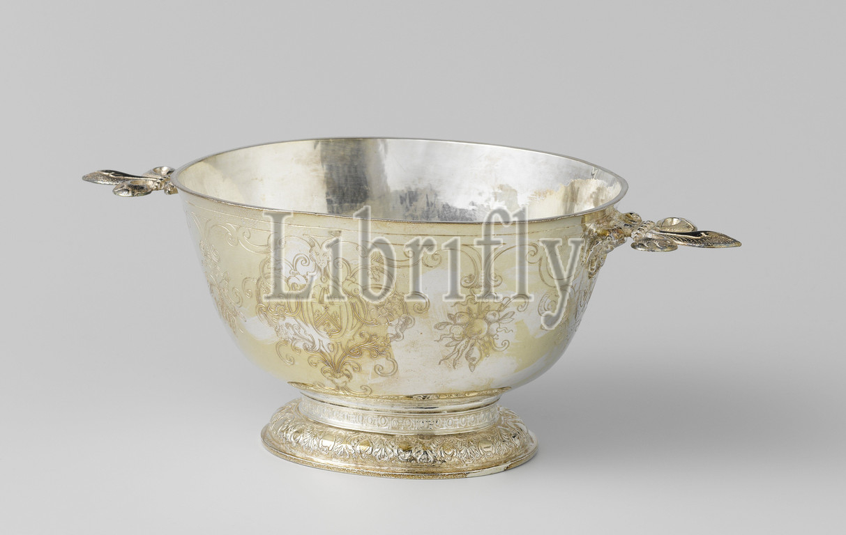 Brandy bowl, black-and-white, high cuppa, decorated, engraving, horizontal, flat ears represent lilies supported, angel heads, Laurens Thomas, Leeuwarden, 1642, metal