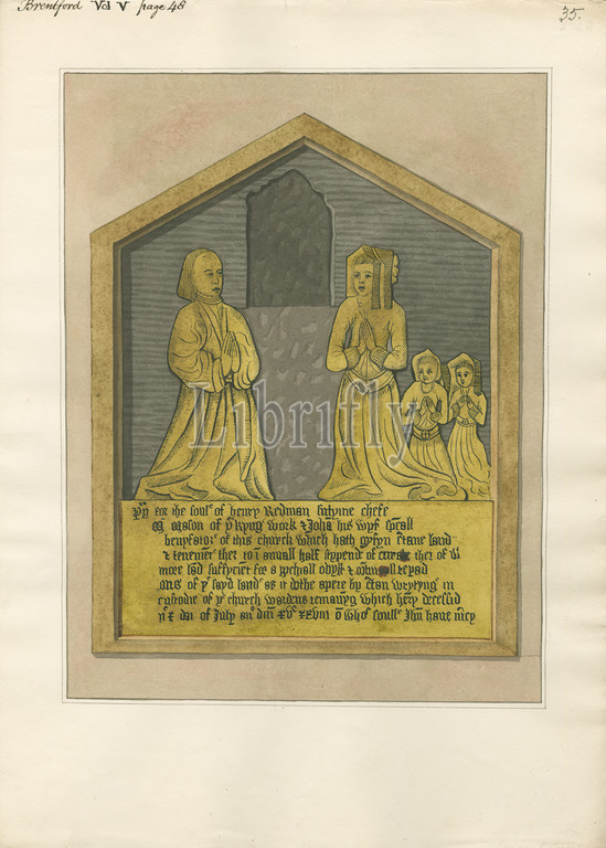 Brass Plate of Henry and Julia Redman and two Children from Brentford Church, Attributed to Daniel Lysons, 1762–1834, British, between 1796 and 1811, Pen and black ink, watercolor and gouache over graphite on medium, slightly textured, cream wove paper, Sheet: 15 × 10 1/2 inches (38.1 × 26.7 cm), architectural subject, brass, church, plate, Brentford Church, England, Greater London, London, Middlesex, United Kingdom
