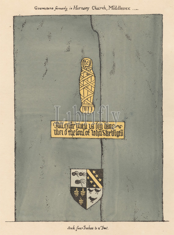 Brass Plate, John Skevington, Hornsey Church, Attributed, Daniel Lysons, 1762–1834, British, 1796, 1811, Pen, black ink, watercolor, gouache, graphite, medium, slightly textured, cream wove paper, Sheet, architectural subject, brass, church, memorial, plate, England, Greater London, Hornsey, Hornsey Parish Church, London, United Kingdom